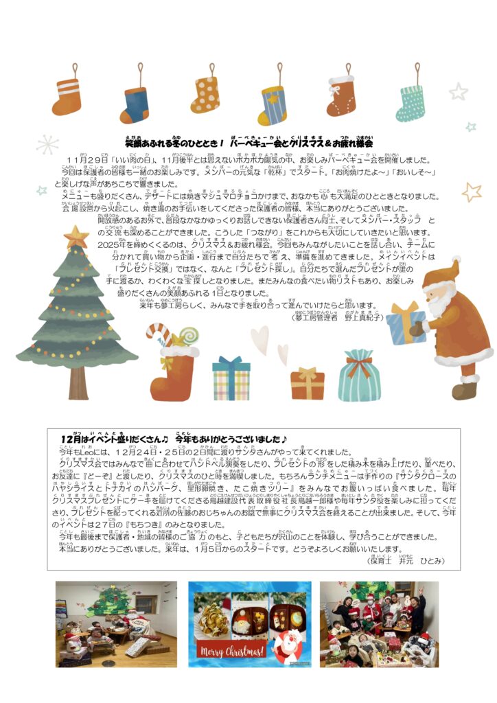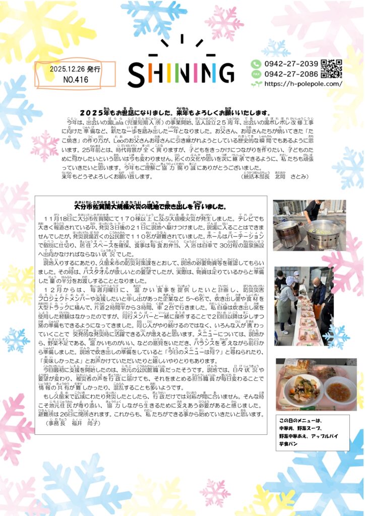 2025年12月26日付けの第416号「シャイニング」を発行しました。2025年もお世話になりました。来年もよろしくお願いいたします。「11月、大分市佐賀関大規模火災の現地で炊き出しを実施」「夢工房・出会いの場Leoの活動報告」を紹介しております。ぜひご覧ください。