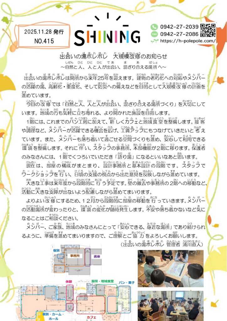 2025年11月28日付けの第415号「シャイニング」を発行しました。「出会いの場ポレポレ 大改修のお知らせ」についてご紹介しています。これからも、自然と人、人と人が出会い、混ざり合える場所を目指してまいります。ぜひご覧ください。