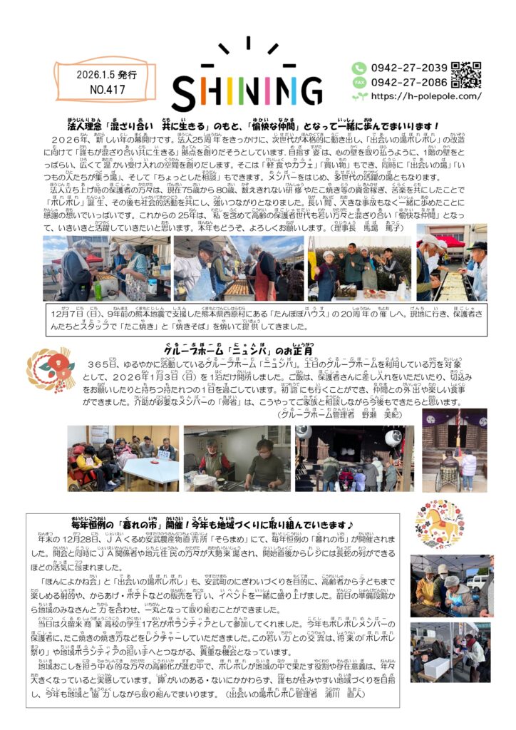 2026年1月5日付けの最新版、第417号「シャイニング」を発行しました。「法人理念『混ざり合い 共に生きる』のもと、愉快な仲間となって一緒に歩んでまいります」「グループホーム『ニュンバ』のお正月」などを紹介しております。ぜひご覧ください。