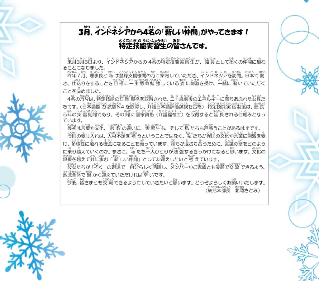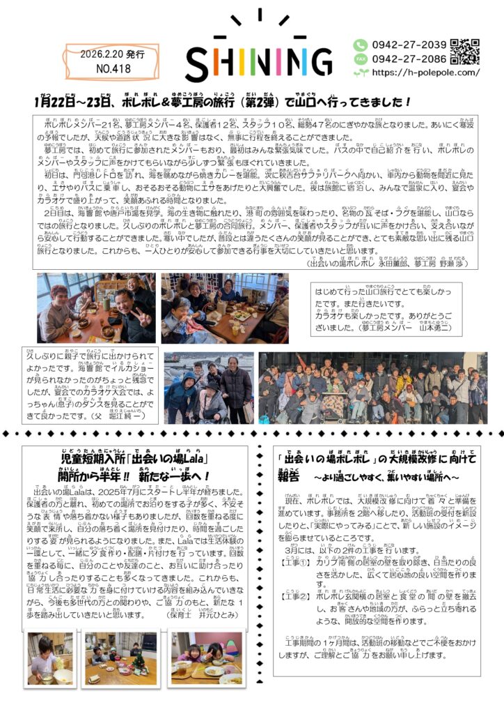 2026年2月20日付けの最新版、第418号「シャイニング」を発行しました。「1月、ポレポレ&夢工房の山口旅行(第2弾)を実施」「出会いの場ポレポレの大規模改修に向けて ご報告」「3月、インドネシアから4名の特定技能実習生の皆さんがやってきます!」などを紹介しております。ぜひご覧ください。